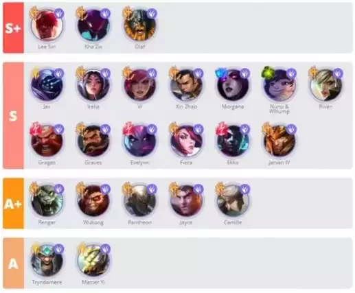 如果说上单是最容易打出对线压制然后拿镀层的位置,那么最能将镀层收益扩大的,自然是有能力争夺峡谷先锋的打野了。武器在被动被改动后不再是T1打野,盲僧和奥拉夫这类前期打架能力极强的则依旧稳坐T1,蔚的强度也有所上涨。