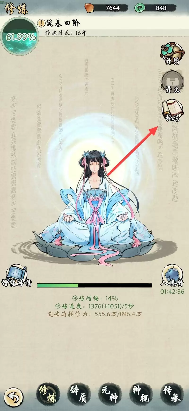 「2」在“洞府”-“修炼界面右上角”-“秘法”处使用。