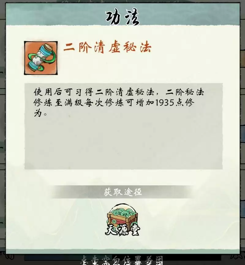 「5」升满之后需要二阶清虚秘法升阶。如图,获取途径为天源堂(氪金商城),目前未开售,无获取途径,但可得知: