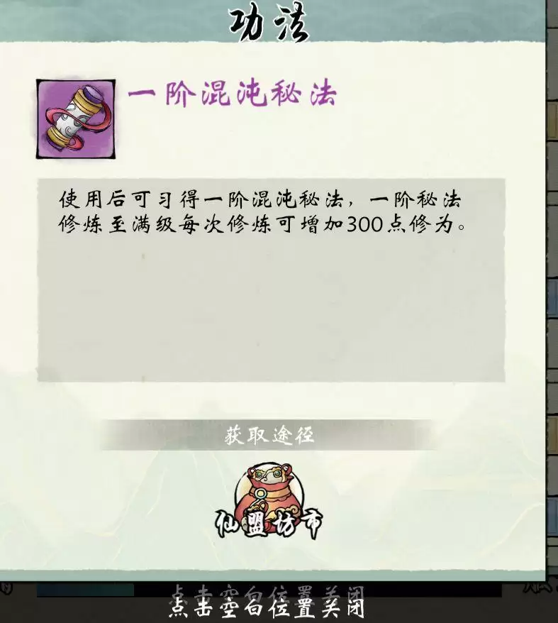 「1」一阶混沌秘法获取途径为“仙盟商店兑换”。