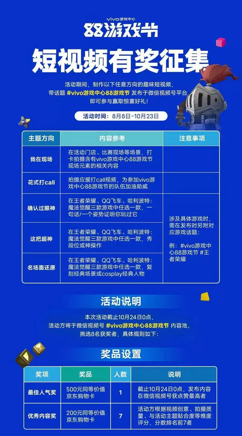 在去年的vivo游戏中心88游戏节,vivo联合各大游戏厂商以新游戏直播发布、线下举办游戏快闪店和线上运营活动等形式,打造深度游戏社区,与游戏玩家互动共娱。该活动吸引线上线下千万人互动参与,为玩家们带来沉浸式游戏体验的同时,也是作为渠道的vivo游戏中心充分发挥流量整合能力、利用运营创新为游戏厂商持续提供新价值的又一次成功探索。今年,vivo游戏中心88游戏节将进行新一轮的升级,推出4城8校的高校巅峰对决,联合《王者荣耀》、《哈利波特:魔法觉醒》、《QQ飞车》三款热门游戏发起高校电竞召集令,邀请8所国内顶级学府的电竞爱好者强势集结、角逐冠军。