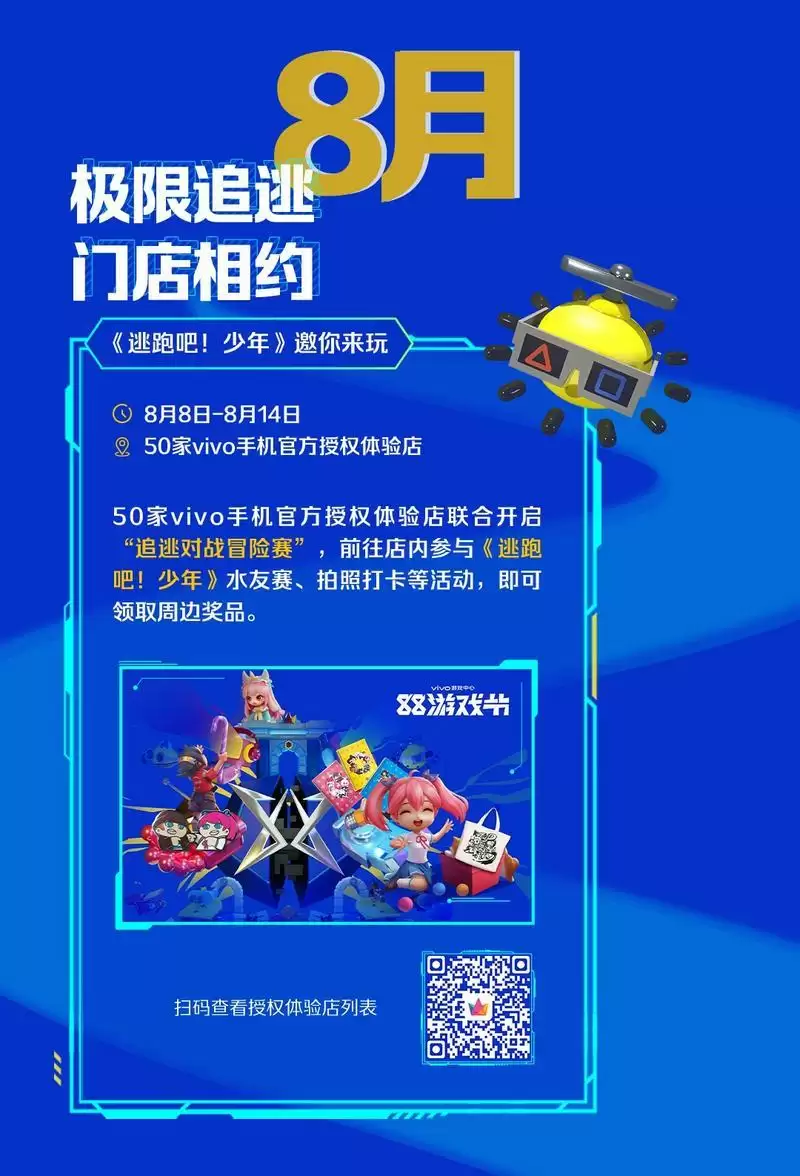值得一提的是,在vivo游戏中心88游戏节电竞季当周,线下门店水友赛活动率先开启,该活动联合手机游戏《逃跑吧少年》展开,覆盖50家vivo官方授权体验店,玩家通过到店打卡及游戏体验互动环节赢得多种现场奖励。