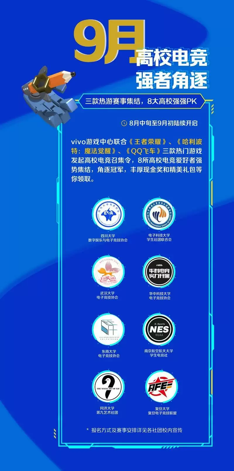 在接下来的8月中旬,vivo游戏中心88游戏节电竞季将开启8大高校校园赛,与各个高校电竞社合作,共同举办《王者荣耀》、《哈利波特:魔法觉醒》、《QQ飞车》电竞赛事;10月初还将在上海、南京、武汉、成都四城举办城市赛活动,邀请高校参与其中,角逐高校赛事强者。