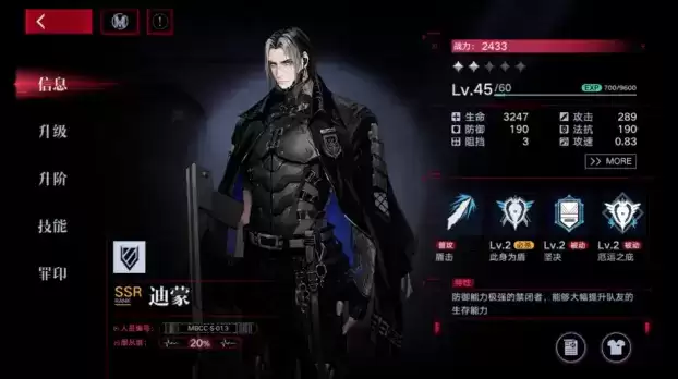 迪蒙:唯一一个SSR的肉盾,必杀为以自己为中心给竖排两个单位上盾,被动为加防和法抗,当有盾存在时,减伤。很不错的技能机制,作为前排可以保护狂暴等一些近战输出,有必练。