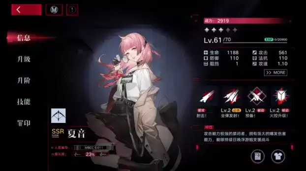 夏音:必杀为激活一个浮游炮,并且增加自身和浮游炮攻击速度,被动一为每隔一定时间增加一个浮游炮,最多四个,被动二为被浮游炮普通攻击命中的敌人,受到的伤害增加。这是一个靠普通攻击输出的角色,需要你搭配好罪印,输出才能更好的打出来,基本后面她再加一个AOE技能的清小怪角色,就能完成全队的输出任务。有必练,输出的唯一神。
