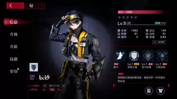 辰砂:必杀为召唤护盾屏障,减少屏障内友方受到的伤害并且持续恢复生命值,被动一为被攻击时,几率获得护盾,被动二为降低处于屏障内的敌方攻击。就技能而言算是SSR迪蒙的下位替代角色,缺少前怕的推荐练一个。