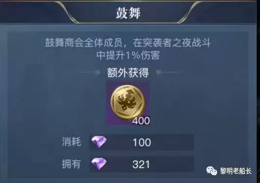 特别需要提一下的是突袭者之夜,这个活动有一个鼓舞系统,玩家可以通过支付100钻石来获得400商贡,次数和所在商会的等级有关,最多可以支付5次。