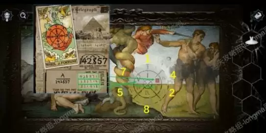 41.回到最右边场景,查看壁画,点击壁画中圆形图案中间一圈的罗马数字,观察外圈罗马数字亮起来的顺序,对照鞋柜中线索纸上的三组数字,最后找出内圈三个正确罗马数字顺序点击通过(比如点击内圈罗马数字3,外圈罗马数字亮起来的顺序就是428571,那这内圈第一个正确数字就是3,以此类推后面两排数字可以得出2和5,于是内圈正确数字顺序是325),依次点击这三个罗马数字,获取壁画中左边女人手中多出来的【苹果】。