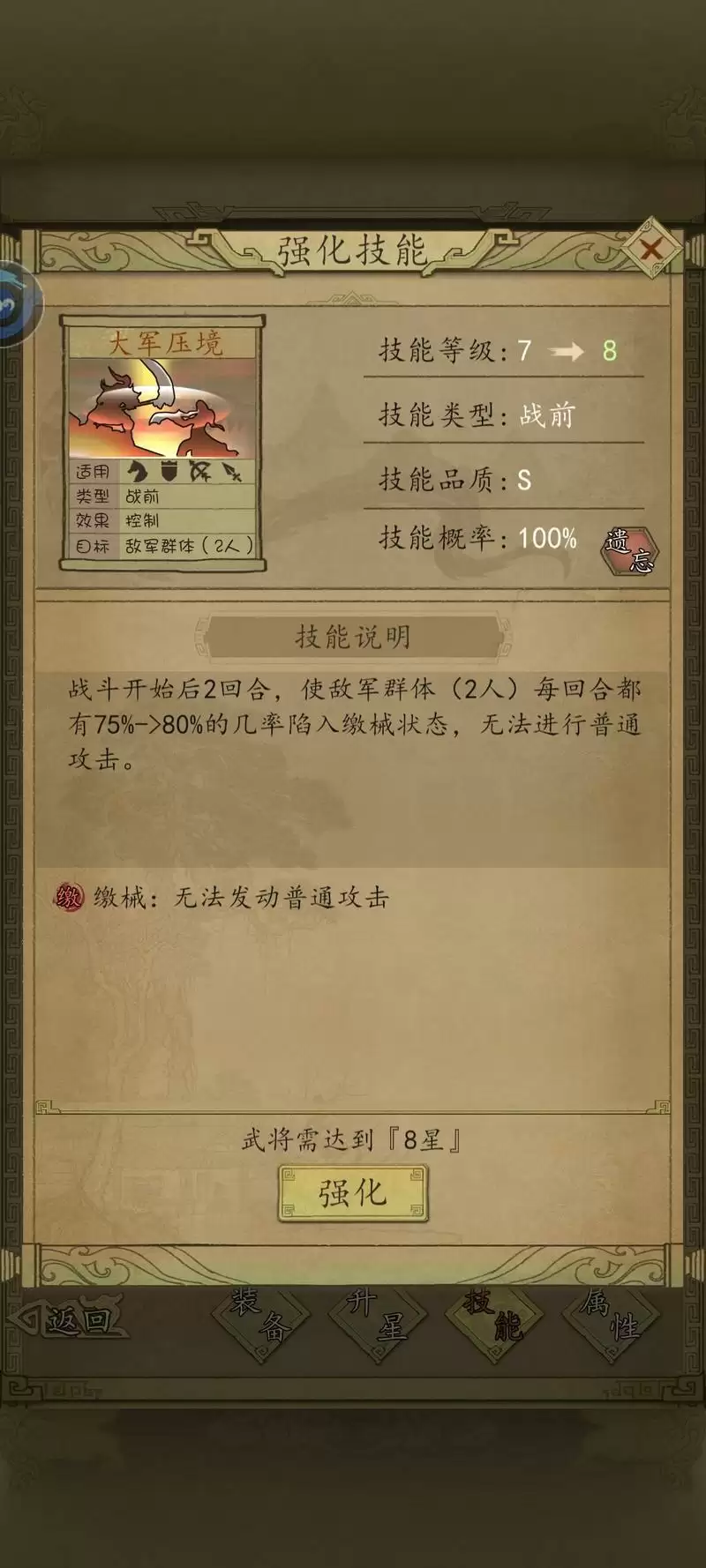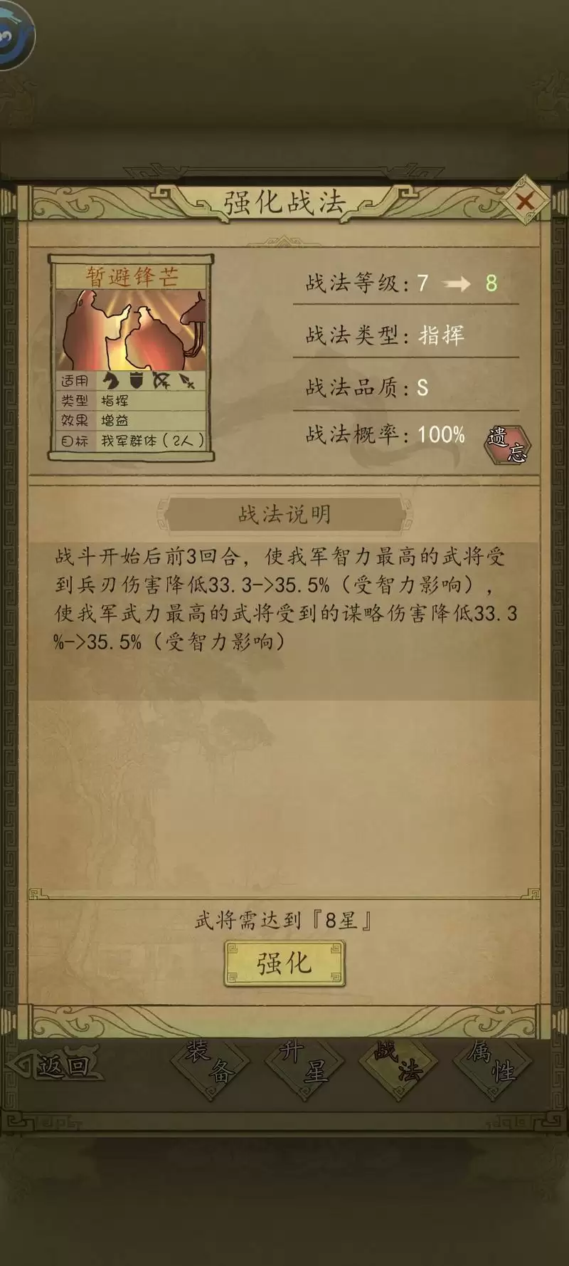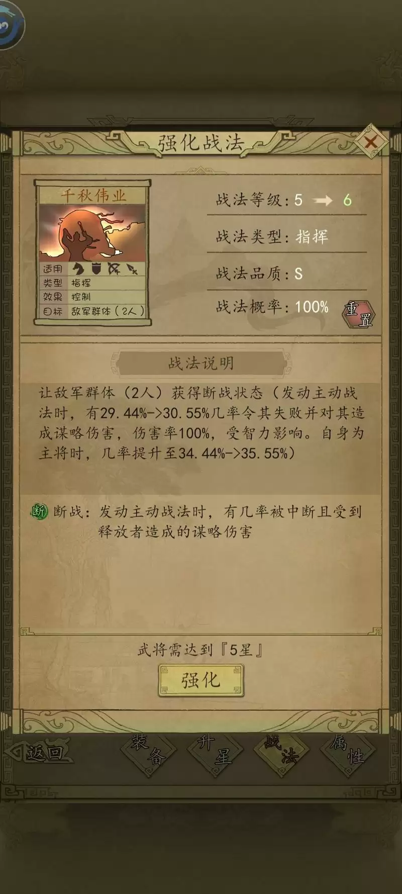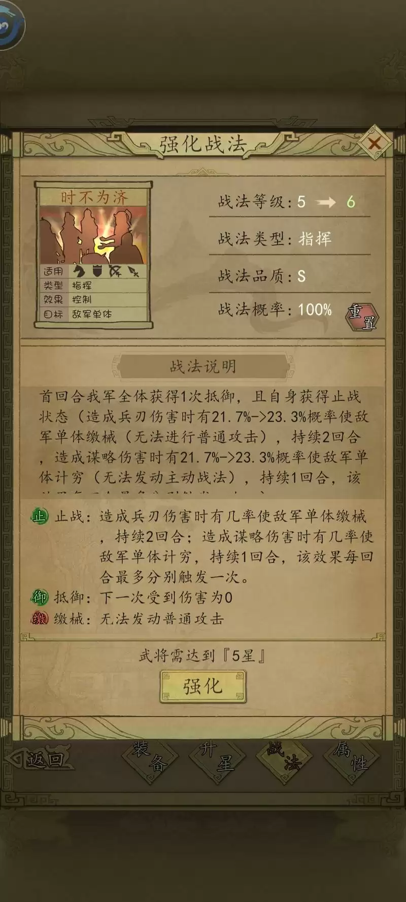 【摧军战阵和大军压境可以互换位置,重点是要速度快的武将携带破阵,优先触发摧军,减防再打伤害】