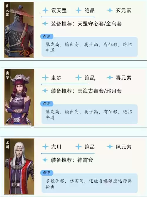 1、袁天罡:爆发高,输出高,属性高,有位移,绝招伤害也超高。
