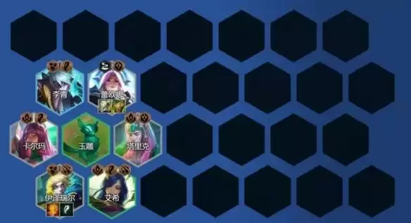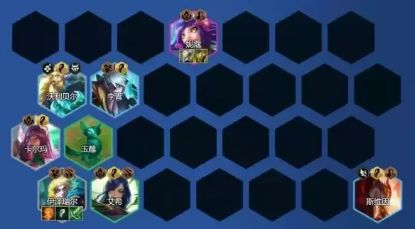 升级8人口,开始大搜卡找到敖兴,1星就可稳血,在没有敖兴之前可先用迭嘉站在后排打工,输出强度也非常高。稳血后就可升级9人口亚索换下沃利贝尔,添加索拉卡或巴德就好,5/10费卡追出2星就可大成。