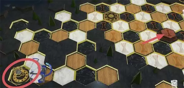 1.先要在圈出来的地方使用机关使凸起的棋盘落下,才能开始正式的解谜。