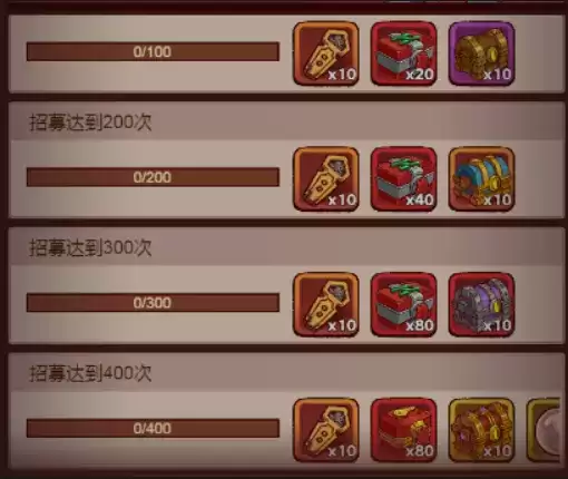根据招募的次数达标获取不同的奖励,活动一共有四轮,每轮分别达到50/100/200/300/400次达标,每轮奖励合计为:珍珠*8、万能红将碎片*80、招募令*50、随机红将碎片*150、宝箱*50