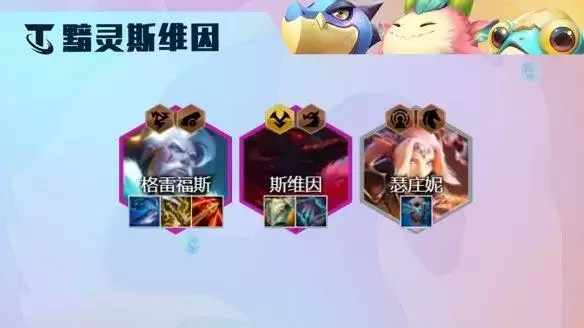 阵容运营:这是一套运营阵容,阵容需要8人口成型,而且核心卡牌斯维因和格雷福斯都是紫卡,建议前期可以用2黯灵龙拼多多过渡,装备优先做出圣盾使的誓约、莫雷洛的秘典等强势过渡装。