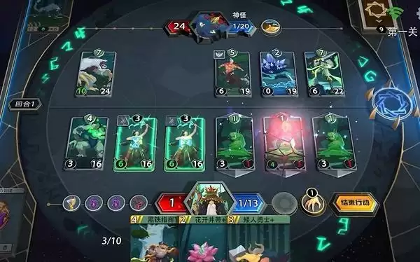 1.回合1:使用英雄主动技能;使用群鸦魅影+随机弃2张牌;使用扭曲意志+交换敌我双方6号位生物;