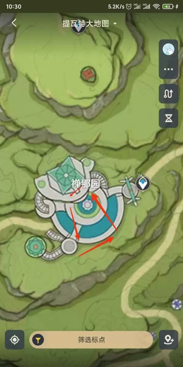 然后来到禅那院传送点,依照下面路线,四个停留点,王树瑞佑冷却15秒,熟练点的话不会浪费一点时间,一分钟四个点全部砍完
