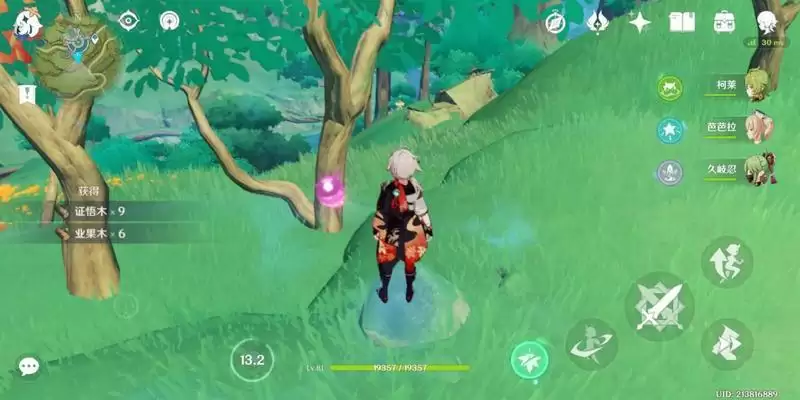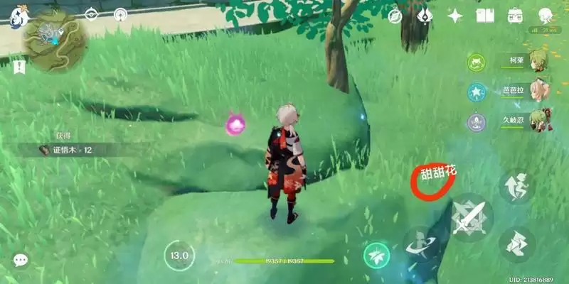 然后视角往左转,已经往面前的树林里走,站在甜甜花旁边的小坡上,获得证悟木*12