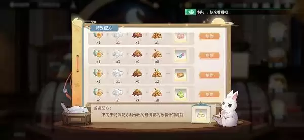 1.团圆月兔:蛋类*1+糖块*1+豆子*1+果仁*1