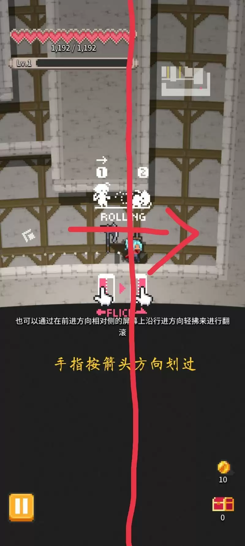 3.翻滚,目前翻滚有两种操作方法,第一种在刹车判定帧失效前快速转换两次方向,比如一开始向左走,点击右之后再快速点击左即可向左翻滚,第二种是用手指画过屏幕两端,比如向左走将手指从右侧屏幕划向左侧即可完成向左翻滚,第二种比第一种完成的流畅度更高,取消了刹车的那几帧。