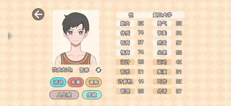(第一个档我选的上课更轻松、提高心情上限、心情降低更慢、多属性。前期每周宿舍睡觉(10-15点压力,5点左右心情),校外公园散步(5-10点心情,1—4点压力),偶尔专门用一周时间放松,后期只需要每周去商场做一次按摩,心情压力健康基本就不会出什么问题)