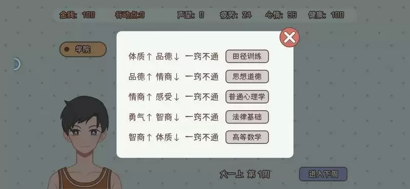 上课的时候建议每周每节课点1次即可。(刚开始的时候我前两周把行动点全砸上课了,结果压力心情直接爆表,三天两头生病😂)