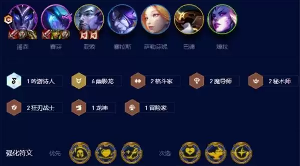 1.阵容组成:潘森,赛芬,塞拉斯,婕拉,萨勒芬妮,亚索,巴德