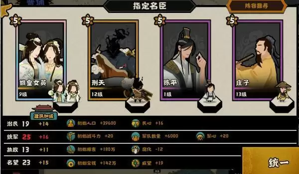 第二套阵容是针对匈奴而言,刑天可以替换为李牧、廉颇这样的防守名臣,配合陈平削弱匈奴战力,进而利用娥皇女英和庄子进攻对方。