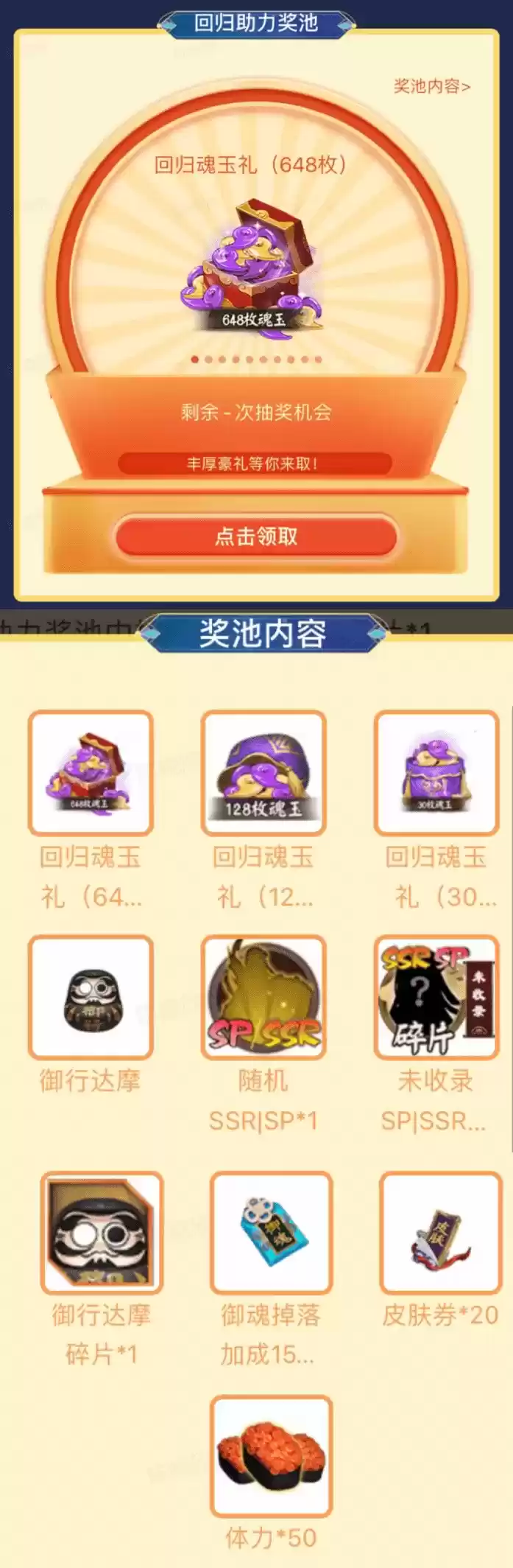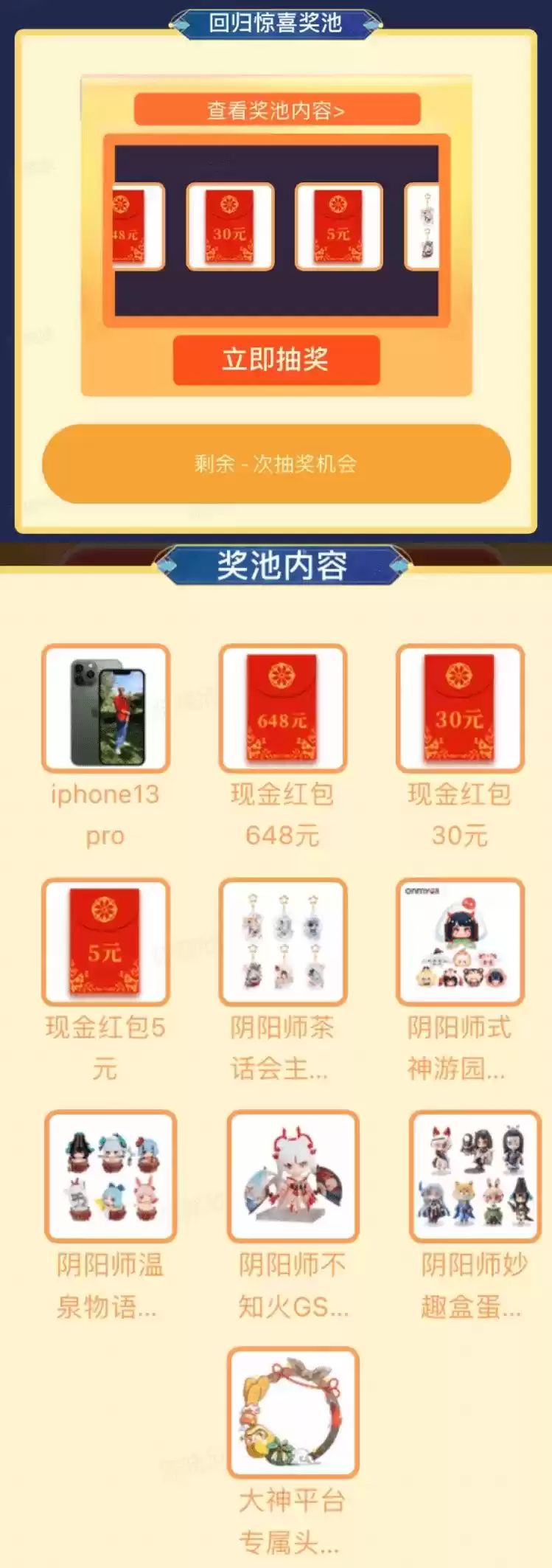 为了迎接你的归来,大神也为你准备了专属好礼~活动期间,完成每日游戏登录、每日召唤、下载更新最新客户端等轻松小任务,即可获得“回归助力券”、“回归惊喜券”抽取对应奖池奖品,阴阳师精美周边、现金红包、回归魂玉礼、iphone13pro等海量回归专属好礼将为你奉上!更有SP、SSR未收录稀有式神碎片等你拿!