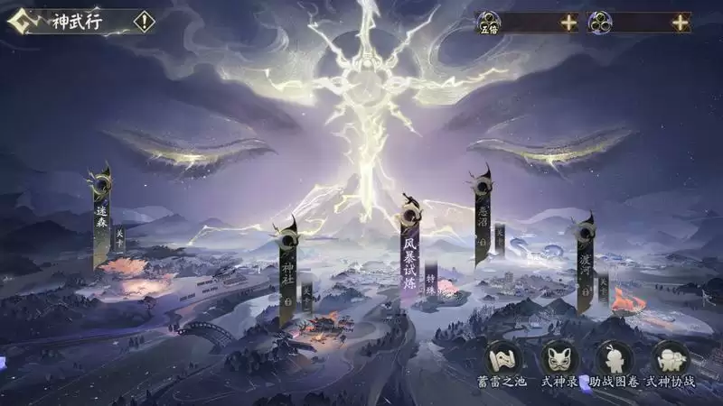 神武行包含四个普通关卡和风暴试炼,通关即可获得「电光晶石」、小鱼干、御魂等奖励。小鱼干可在伊吹宝库中兑换奖励,电光晶石可在神武行玩法中提升须佐之男的属性。