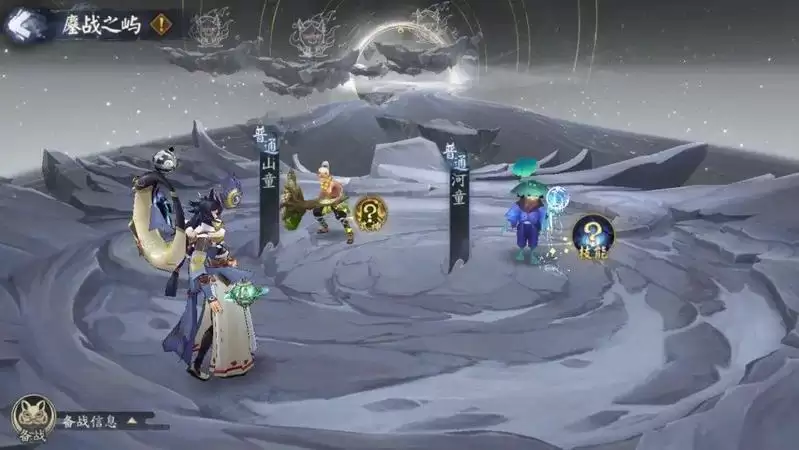 阴阳师们可在月之海页面左下角点击备战按钮,查看当前式神的属性和状态,对荒进行养成配置,最多可为荒配置4个技能,技能可在月之海事件中获得,当获得相同技能时将自动升级。当助战式神血量为0时将进入迷失状态,无法参战。