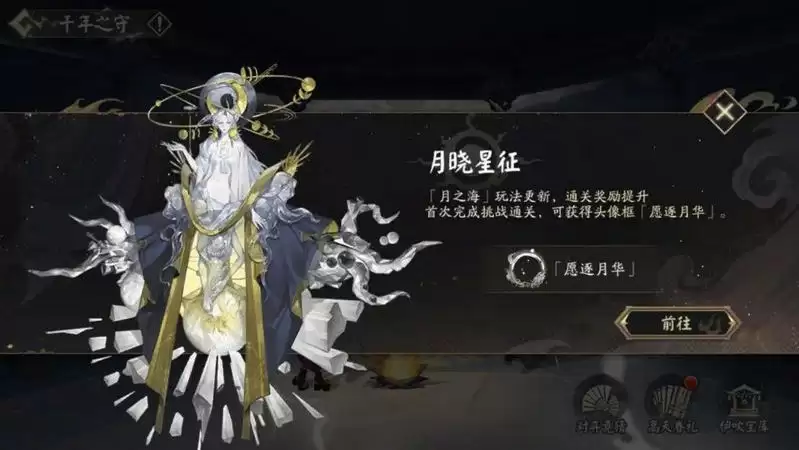 完成19个事件后即可挑战月读,战斗前可点击首领技查看月读的特殊机制。成功挑战月读后将根据通关月之海的评分获得不同数量的月之钥,评分由高到低分为极、特、优、良、中。9月24日月之海玩法将进行更新,根据月读的两种状态,挑战分为两个战斗阶段。阴阳师们届时首次成功通关即可获得动态头像框「愿逐月华」。