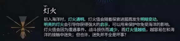 明亮的灯火会引导你获得强大的启示,可以用来保护你免受海洋的影响。灯火值会因为遭遇事件、战斗损伤而减少,而灯火值越低,越容易在和海洋的接触中迷失;但也许,迷失并不全是坏事?