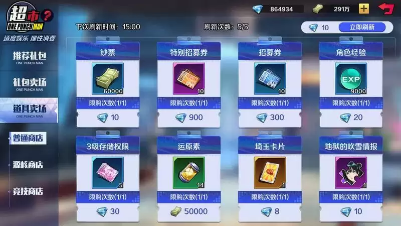 在你决定用钻石购买什么的时候,建议优先来超市的道具卖场看一看,因为这里购买的东西,往往比在外面直接用钻石买要便宜。比如说特别招募券,直接在招募界面买的话,一张是100钻,一次十连抽就要1000钻,但是在这里只需要900。最关键的是,就算你只打算买特别招募券这一种道具,用10钻刷新一次,总价是910钻,也比1000钻要便宜。