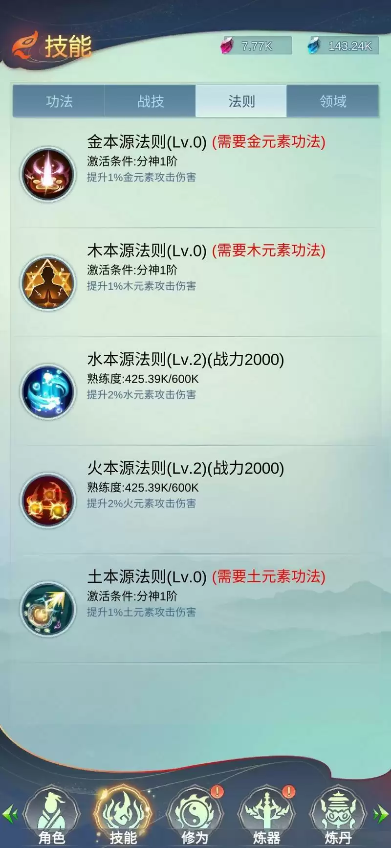 如图所示-元素基础功法是我们升级境界必须提升的!可以为我们带来相关灵根的攻击和抗性《目前元素功法上限500级》