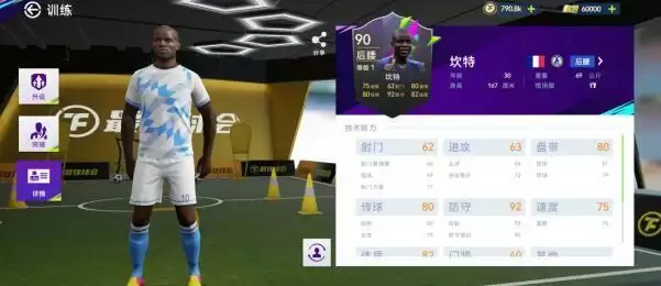 “地球70%是水,另外30%则被坎特覆盖。”作为世界最佳防守型中场之一,坎特拥有顶级抢断技巧,防守值高达92。他在球场有惊人的跑动能力,在进攻端能力也一流。虽然法国人身高只有168cm,但他无论移动还是身体对抗也很出色,速度和爆发力都是一流,速度值达到了相当高的75!