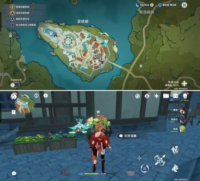 来到蒙德城传送点东南侧,前往如图位置,在猎鹿人餐馆后方取得宝箱四。