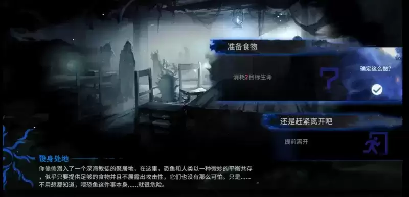 你偷偷潜入了一个深海教徒的聚居地,在这里,恐鱼和人类以一种微妙的平衡共存,似乎只要提供足够的食物并且不展露出攻击性,它们也没有那么可怕。只是.......不用想都知道了,喂恐鱼这件事情本身......就很危险。