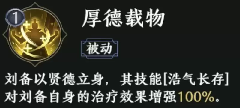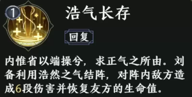 作为将军的初始武将,刘备拥有极高的生存和辅助能力,其技能【浩气长存】可在原地结阵,此阵不仅能对周围敌人造成多段伤害,还能为阵内队友回复生命值,配合刘备的被动【厚德载物】,可使该技能对刘备自身的治疗效果增强至少100%。