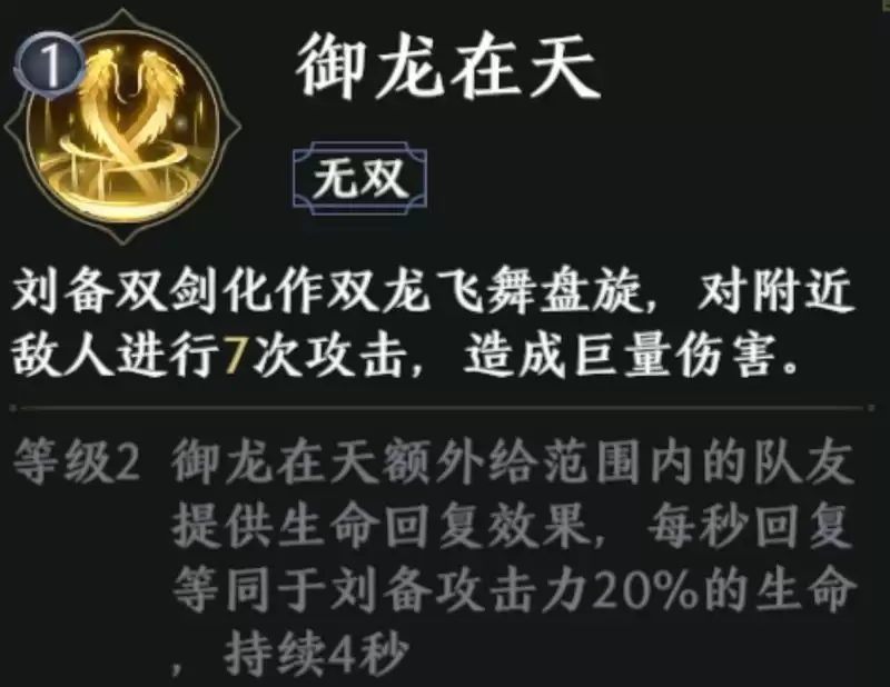 刘备的无双技【御龙在天】,有着高达7次的多段伤害,在该等级达到2级后,还可以在其4秒的持续时间内,每秒回复等同于刘备攻击力20%的生命,作为副将时,也可及时为主将提供可观的治疗量。