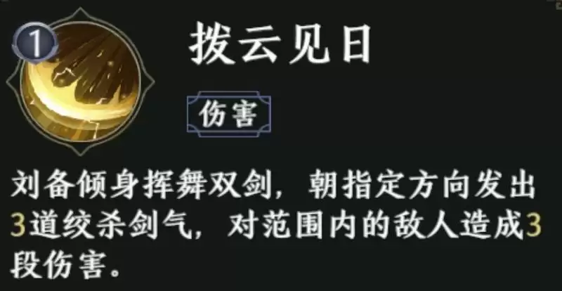 此外,刘备也具备多段伤害清兵技能【拔云见日】,搭配好回复技能快速清兵积攒无双技,作为主将时,完全可以成为前期推图的“永动机”。
