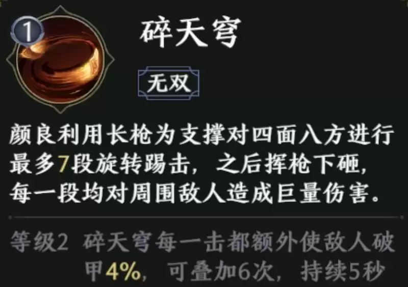其无双技【破苍穹】可进行7段攻击,在该技能达到2级后,每一段攻击可使敌人破甲4%,该破甲效果可叠加六次,持续5秒,在叠加破甲后,搭配高攻击武将切换或副将大招,可快速使boss陷入破防状态,短时间内造成巨量伤害。