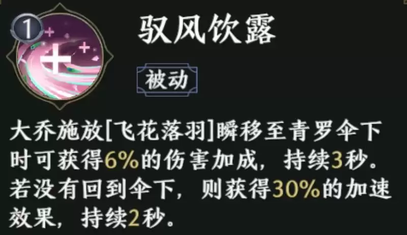 说到三国美人,江东二乔自然名列前茅。作为前期将军最容易获得的红将,大乔不仅拥有优秀的攻击范围、高额的伤害能力,还拥有远程攻击武将必备的位移和加速技能。大乔作为远程武将,其生命值相较近战武将来说较弱。但其位移技能【飞花落雨】搭配被动技能【驭风饮露】,在使用飞花落雨2段时,可以瞬间移动到伞下的方式躲避技能,并获得30%的加速效果,可持续2秒。两个技能搭配得当,可快速与敌人拉开距离,减少收到的伤害,提升自身生存能力。