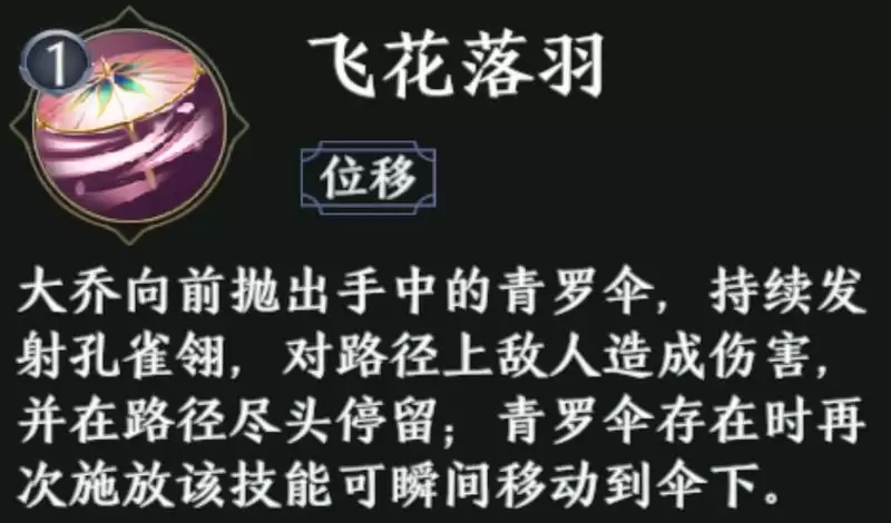 大乔的无双技【青影风华】可在前方释放范围极大的伞阵,造成14段的巨量伤害;若该技能达到2级,则在造成高额伤害的同时,每一段攻击还可回复等同于大乔攻击力12%的生命值。