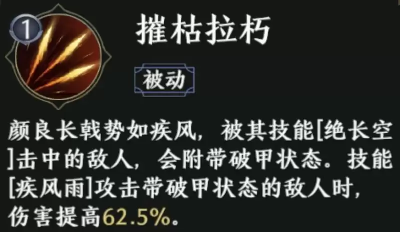 别看这位武将各方面的数据平平无奇,他可是前期解决BOSS护甲重要的武将之一。颜良作为橙色武将,随生命值并不优秀,但可通过闪避和位移技能【绝长空】来及时躲避伤害,提升生存空间;而位移技能【绝长空】搭配其被动【摧枯拉朽】,不仅能够在位移的同时使敌人减速,还能使敌人破甲,受到额外伤害。