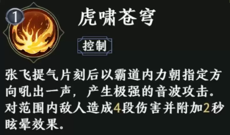 作为前期较易获得的红色武将,张飞在拥有极高近战伤害的同时,也有着优秀的控制能力。其控制技【虎啸苍穹】可向指定方向释放音波攻击,对范围内敌人造成4段伤害并附加2秒眩晕效果。在攻击BOSS这样不吃控制的敌人时,也能快速削减对方的霸体值(白条)。