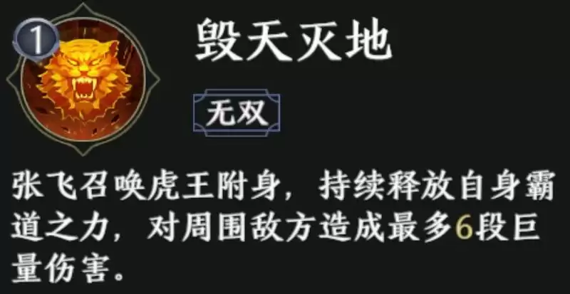 张飞的无双技【毁天灭地】,可凭借其大攻击范围,高伤害,快速起手的特点来快速清理周围敌人,作为副将使用时效果奇佳。