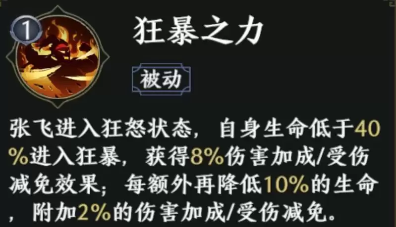 张飞的被动技能【狂暴之力】可以使张飞生命低于40%时进入狂暴状态,获得8%的伤害加成和受伤减免效果,并且每额外再次降低10%生命,会继续附加2%的伤害加成及受伤减免效果,在较低生命值的情况下其作战能力会极大增强。