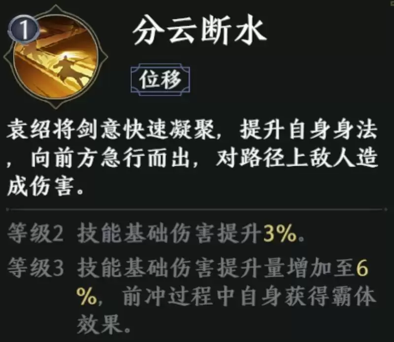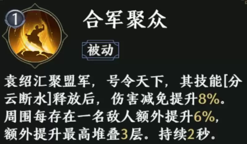 其技能【分云断水】可向前方冲刺,并对路上敌人造成高额伤害,且该技能等级达到3级后,冲刺时,袁绍会处于霸体状态,免疫一切伤害和控制,战斗中可通过此技能躲避BOSS的高伤害或控制技能。且在使用该技能后,其被动【合军聚众】可在周围存在敌人的情况下,为袁绍叠加最多3层的伤害减免效果。