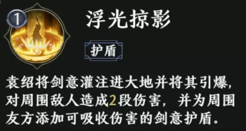 除此之外,袁绍还有着少见的护盾技能【浮光掠影】,该技能可在对敌方造成伤害的同时,为袁绍及附近友军添加可吸收伤害的护盾。搭配其被动技能,使袁绍的生存能力更上一层楼。