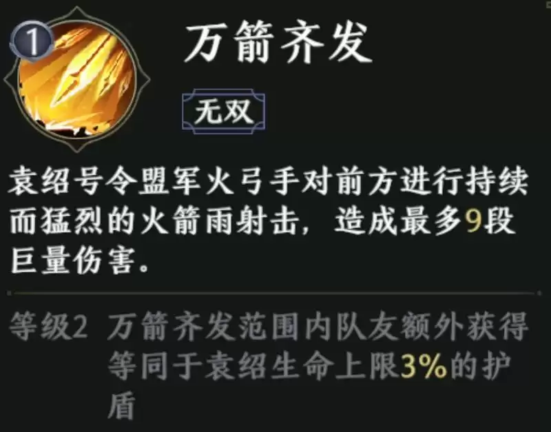 其无双技【万箭齐发】,可以瞬间向袁绍前方发射猛烈的箭雨,在技能等级达到2级后,该无双技可在造成9段巨量伤害的同时为队友添加护盾,作为副将时,不仅可以快速清理敌军,还可以紧急救场哦~